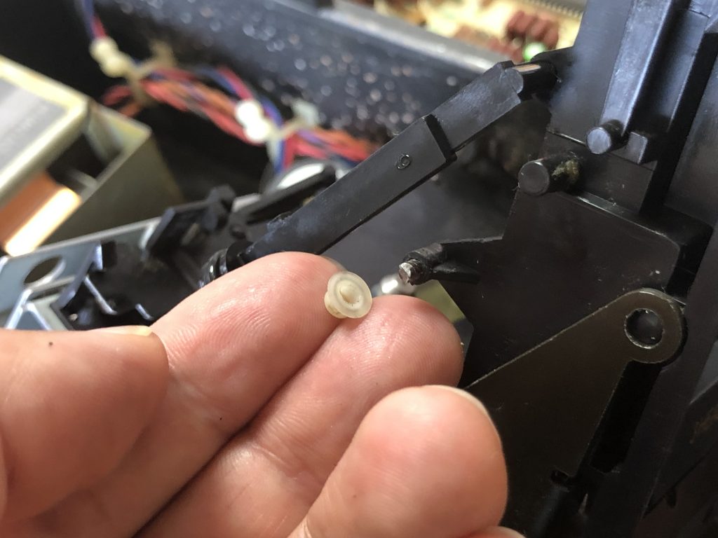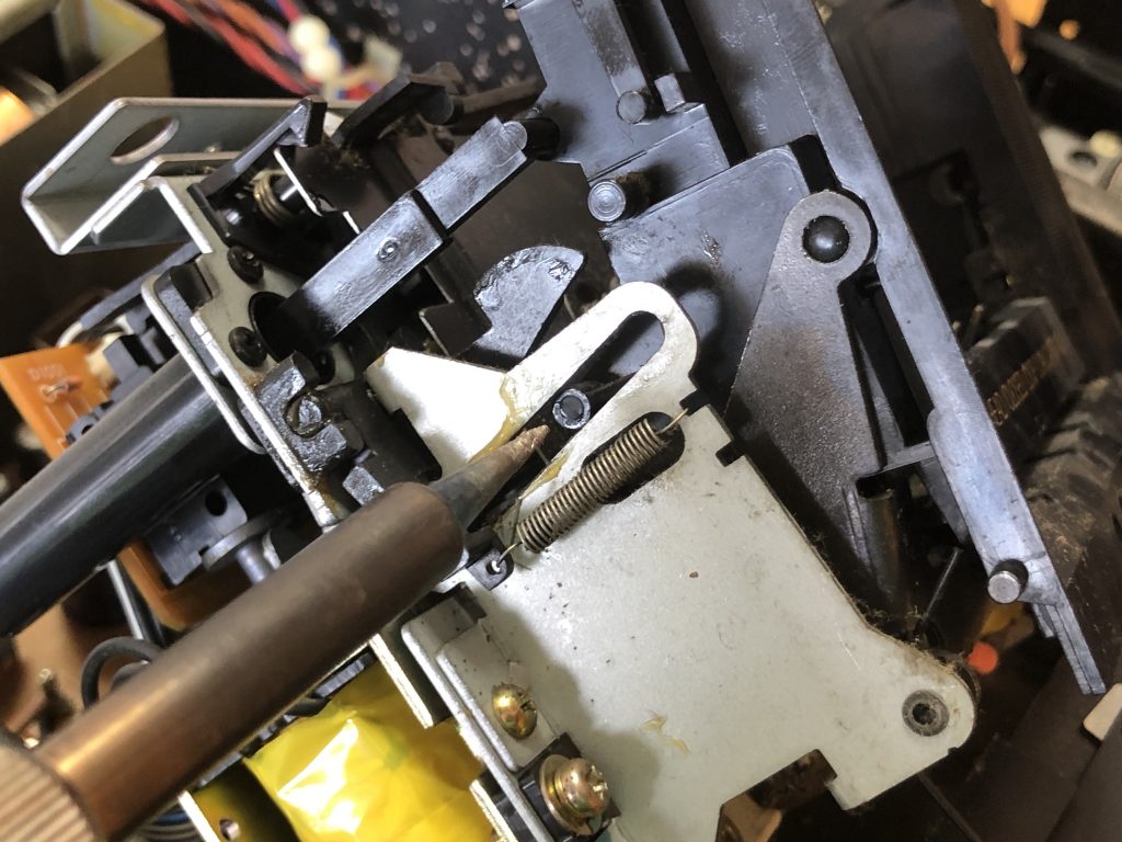 分解の段階で磁気ヘッドが上がっていないとメカデッキ部分が外せないことがわかり一旦電源を入れて再生状態にしてから取り出す流れにしたのだが、その後電源を抜き忘れ、ずっと通電状態で作業をしていた事に気がつかなかった…
