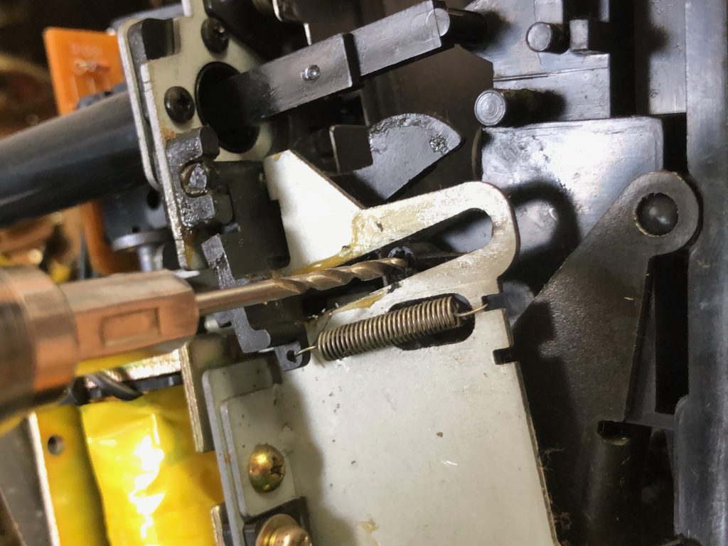 写真中央の斜めに走るレールの中に黒い樹脂のピンが差し込まれているはずが折れてしまっている。今回はこの部分に穴を開けネジを入れて修理しようと思います。